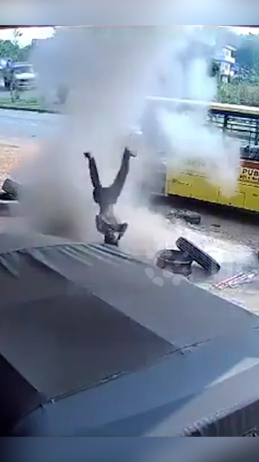 Lốp xe phát nổ, hất văng người đàn ông lên không trung