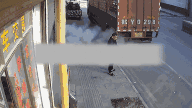 Người đàn ông thoát chết trong gang tấc khi chiếc lốp xe tải bất ngờ nổ như bom tại huyện Tonghai (Vân Nam, Trung Quốc).
