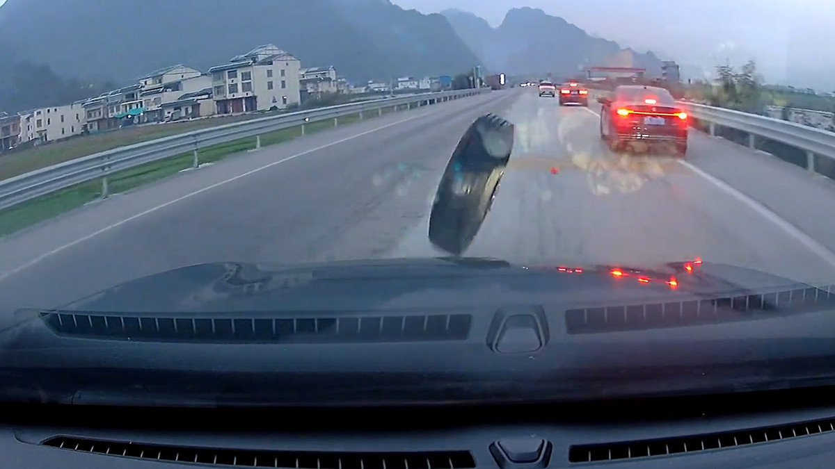 Chiếc lốp văng ra từ xe tải ra giữa đường rồi đập mạnh vào đầu ô tô đi ngược chiều trên đường tại TP Hechi (Quảng Tây, Trung Quốc) khiến tài xế không kịp trở tay.
