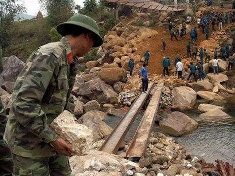 | Thi công cầu tạm thay thế cầu treo bị sập. |