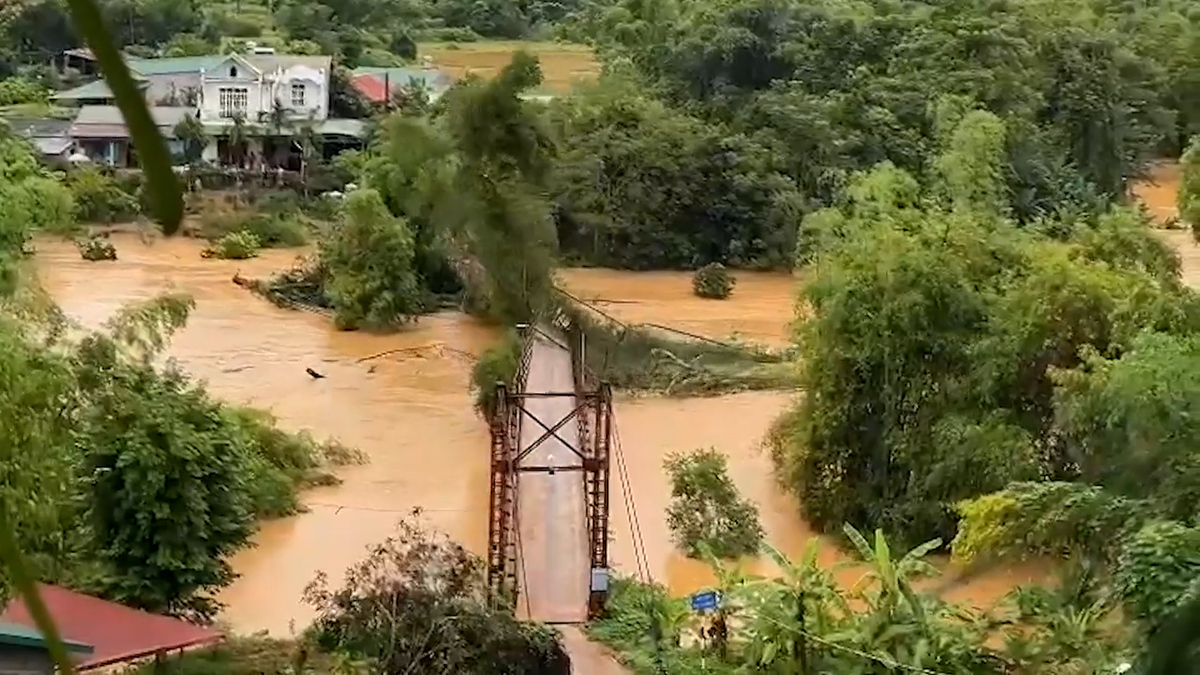 Dòng lũ đục ngầu ầm ầm tràn đến, chỉ trong chớp mắt, cầu treo Nà Hoàng ở phường Tân Giang, Cao Bằng, bị dòng nước dữ tợn tàn phá, biến dạng nghiêm trọng.