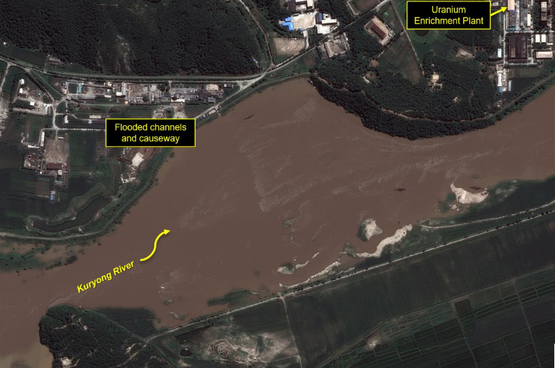 38 North, tổ chức theo dõi và phân tích Triều Tiên có trụ sở tại Mỹ, hôm 12/8 công bố hình ảnh vệ tinh cho thấy nước lũ đe dọa nhà máy hạt nhân Yongbyon ở tỉnh Bắc Pyongan, cách thủ đô Bình Nhưỡng hơn 100 km về phía bắc, hồi đầu tháng 8.