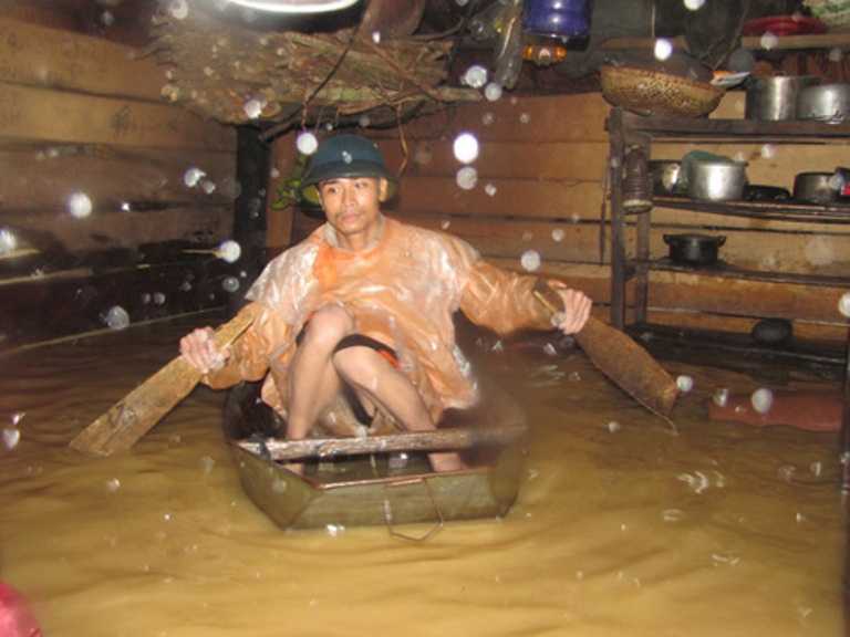 | Người dân huyện Vũ Quang (Hà Tĩnh) phải dùng thuyền để đi lại trong nhà. Ảnh: TNO |