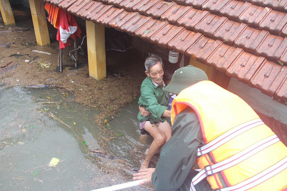 Lực lượng chức năng giúp người dân di chuyển đến nơi an toàn khi nước lũ dâng cao trong chiều qua (11/10).