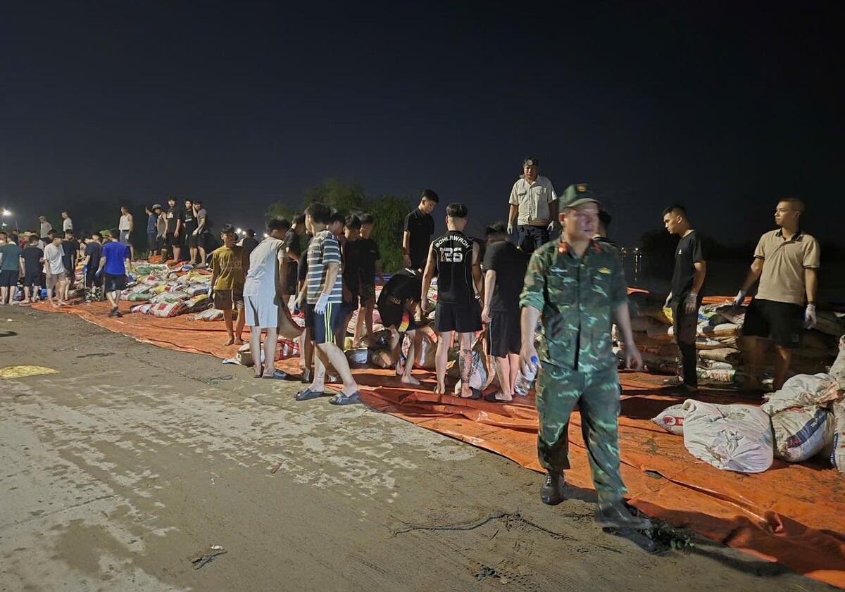 Trước diễn biến lũ trên sông Cầu, lúc 20h ngày 8/10, Ban Chỉ huy Phòng thủ dân sự phường Kinh Bắc huy động hàng trăm cán bộ, chiến sĩ, dân quân cùng hàng nghìn người dân khu phố Đẩu Hàn đắp nâng cao tuyến đê bối.