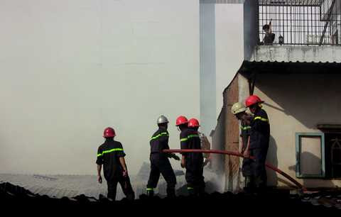 Nhận được tin báo, 11 xe chữa cháy của cùng hàng chục chiến sĩ PCCC quận Bình Tân và quận Tân Phú đã đến hiện trường, tiếp cận đám cháy.