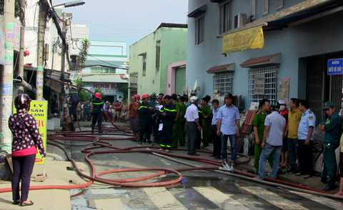 | Nhiều người dân đứng xem lực lượng chức năng khống chế đám cháy. |