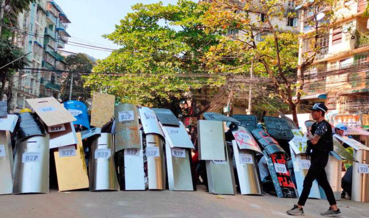 Người biểu tình Myanmar tạo lá chắn tại Nyaung-U. (Ảnh: Reuters)