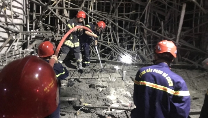 Lực lượng chức năng dùng máy móc, thiết bị để phá các cấu kiện để đưa nạn nhân ra ngoài trong vụ sập giàn giáo ở Đà Nẵng.