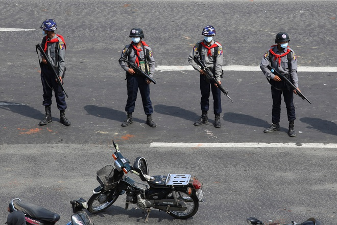 Cảnh sát trên đường phố Naypyidaw hôm 8/2. (Ảnh: Reuters)
