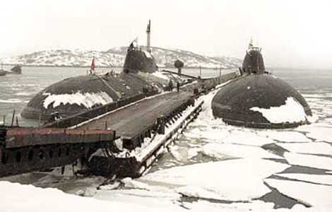 Ngoài cùng bên phải là tàu ngầm nguyên tử dự án 671, ở giữa và bên trái là tàu ngầm nguyên tử trang bị tên lửa hành trình.