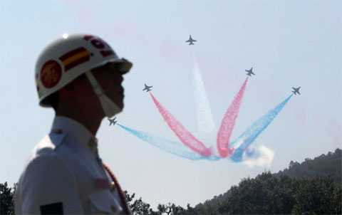 (VTC News) - Hàn Quốc hôm qua tổ chức lễ kỷ niệm 64 năm ngày thành lập lực lượng vũ trang nước này, với những màn nhào lộn của máy bay trình diễn và các pha biểu diễn võ thuật của lực lượng quân sự đặc biệt.