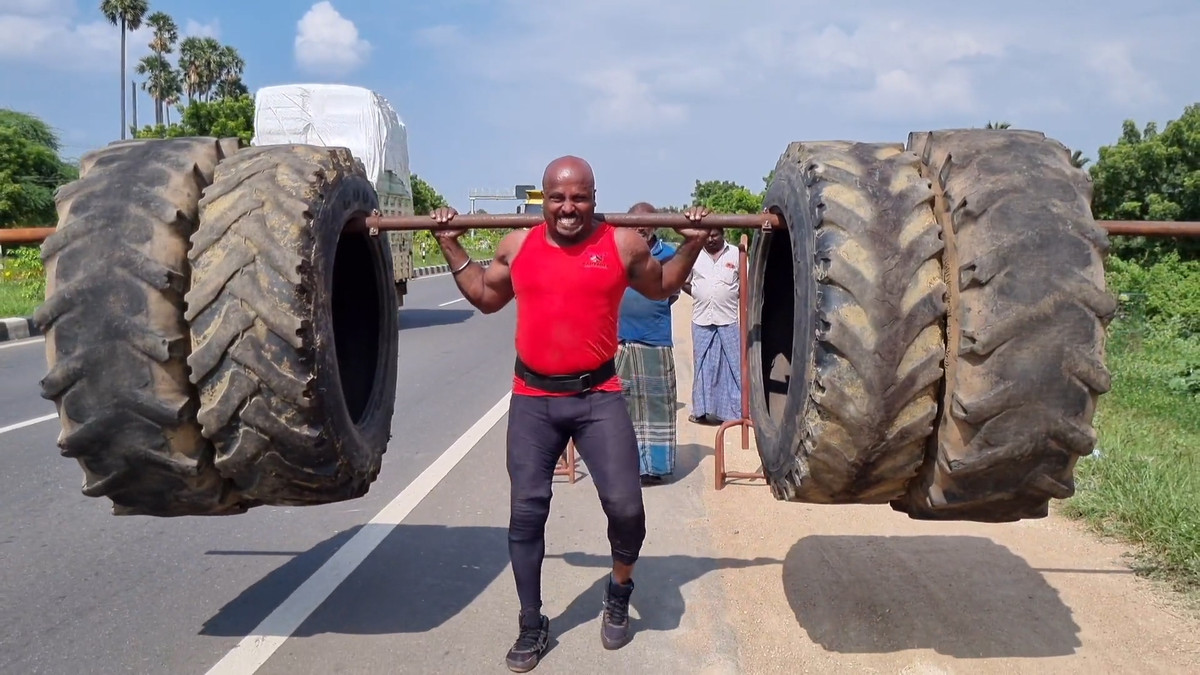 Anh Kannan (39 tuổi) một vận động viên thể hình đã nâng 4 lốp xe tải nặng gần 350 kg và đi bộ hơn 50m tại Kanniyakumari, bang Tamil Nadu, Ấn Độ.