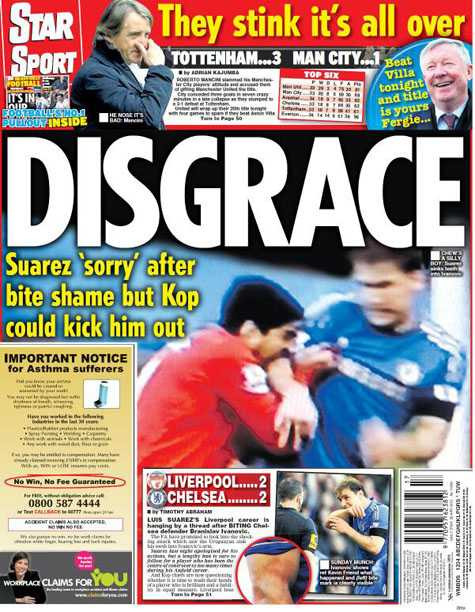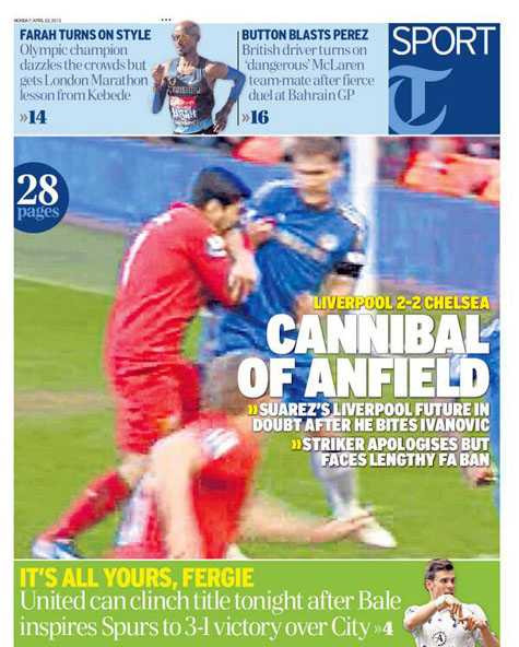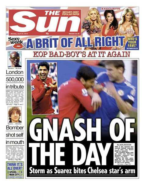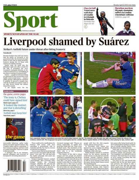 Trên trang bìa của tờ The Sun, bức ảnh chụp lại cảnh Suarez cắn Ivanovic đã được tờ báo này chú thích kèm dòng chữ vô cùng mỉa mai: "Cú cắn trong ngày". Bên cạnh đó, tờ báo lá cải bán chạy này còn dự đoán, dông tố nhiều khả năng sẽ nổi lên ở Anfield sau hành vi phản cảm này.