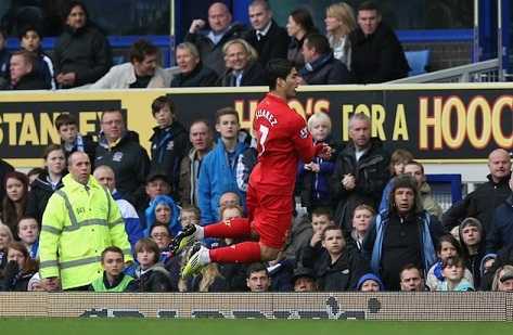 Sau khi tung cú sút cực mạnh khiến Baines lúng túng đá phản lưới nhà ở phút 14, Suarez đã chạy đến phía trước ban huấn luyện của Everton và ăn mừng bàn thắng bằng cách thực hiện một cú ngã giả vờ nhằm trêu tức đối thủ và các cổ động viên đối phương. Tuy nhiên, ông David Moyes cũng không lấy đó làm tức giận, và thậm chí còn chia sẻ với báo chí sau trận đấu rằng "tôi cũng sẽ làm như vậy nếu ghi bàn".