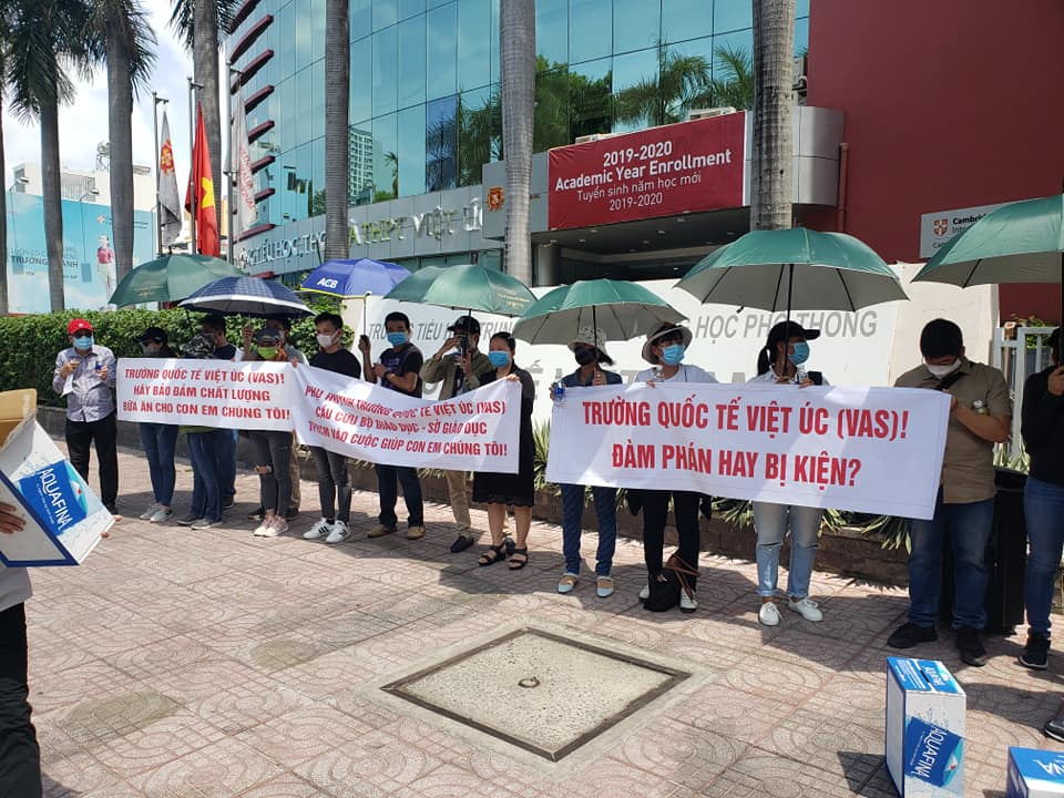 Trưa 14/5, hàng trăm phụ huynh trường Quốc tế Việt Úc (VAS) lại tập trung trước cơ sở ở đường 3/2 phản đối chính sách thu học phí online và việc tăng thời gian học sau khi trường này gửi bảng kê chi tiết cho phụ huynh.