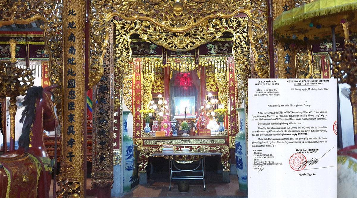 Sau bài viết đăng trên Báo điện tử VTC News ngày 10/5: “Lùm xùm sử dụng tiền công đức: TP Hải Phòng chỉ đạo, huyện xã xử lý không xong”, xảy ra tại khu di tích đền – chùa Cái Tắt, xã An Đồng huyện An Dương, UBND TP Hải Phòng giao UBND huyện An Dương chủ trì, cùng các cơ quan liên quan khẩn trương kiểm tra vấn đề báo nêu, tập trung giải quyết dứt điểm vụ việc, báo cáo UBND Thành phố trước ngày 30/5/2022.