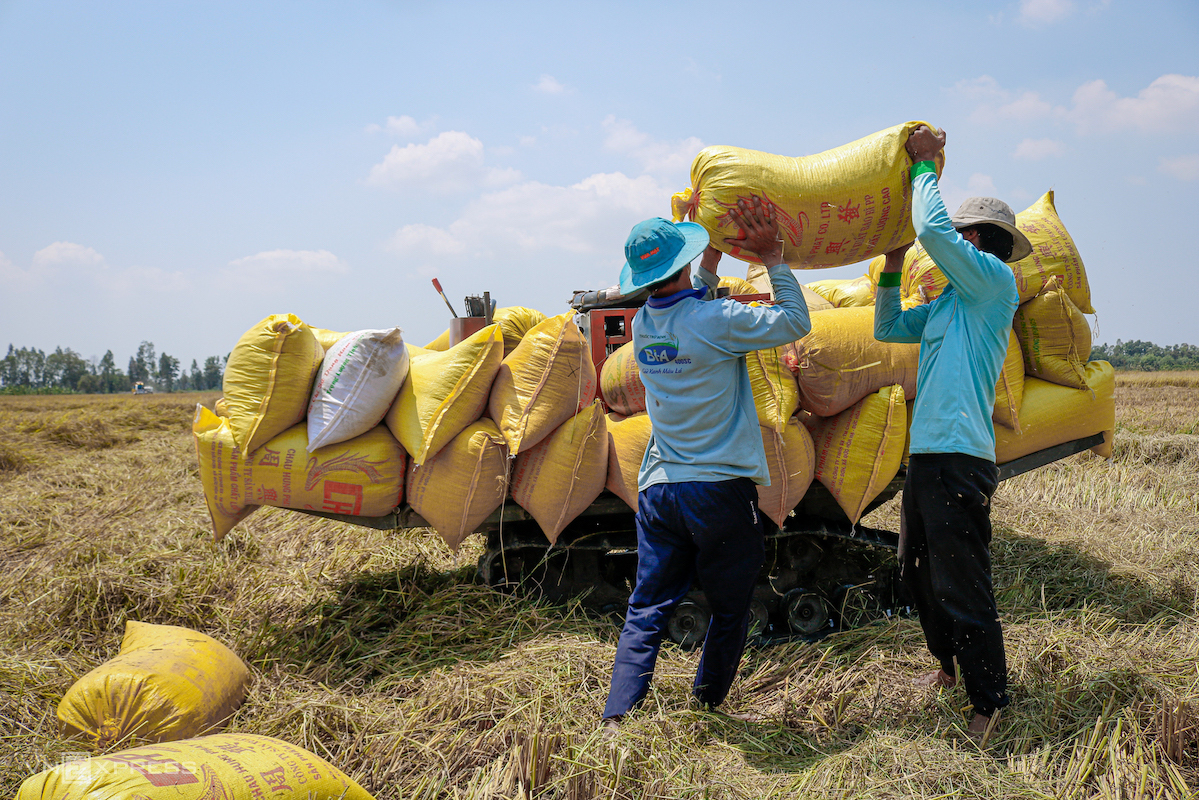 Nông dân thị xã Ngã Năm (Sóc Trăng) thu hoạch lúa vụ Đông Xuân. Ảnh chụp ngày 10/3/2020. (Ảnh: Nguyệt Nhi)