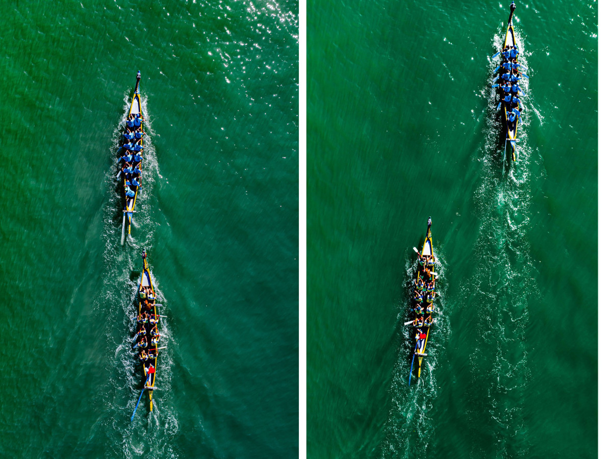 Màu sắc của trang phục, của thuyền rồng và màu sắc của 2 dòng nước giao thoa trên biển (nước cửa sông và nước biển) tạo nên một bức tranh ranh giới tuyệt đẹp.