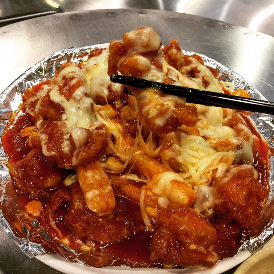 Nếu là một tín đồ của phô mai thì bạn nhất định không thể bỏ qua món ăn này. Gà được tẩm bột rồi đem chiên giòn, sau đó nấu với nước sốt đậm đà và tokbokki, cuối cùng phủ lên trên một lớp phô mai dày dặn. Gắp một miếng gà, quấn bên ngoài những sợi phô mai dai dai, béo ngậy sẽ rất tuyệt đấy nhé.