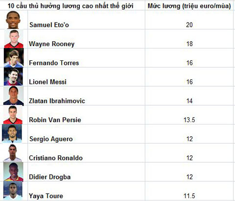 | 10 cầu thủ hưởng lương cao nhất thế giới hiện nay |