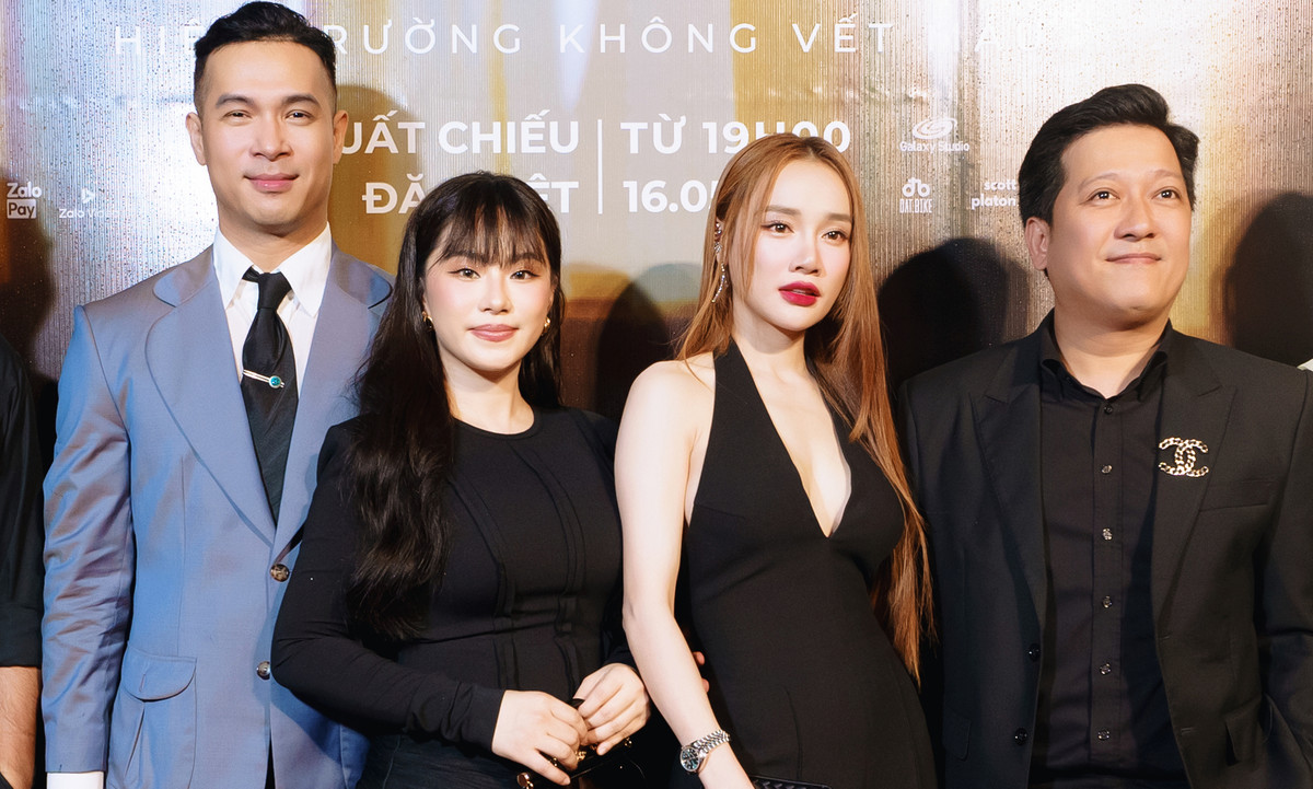 Vợ chồng Trường Giang - Nhã Phương diện đồ đen sang tới xem phim. Đồng hành cùng hai vợ chồng còn có Thuý Ngân và Tiến Luật. Đây đề là những đồng nghiệp thân thiết của Trương Thế Vinh.