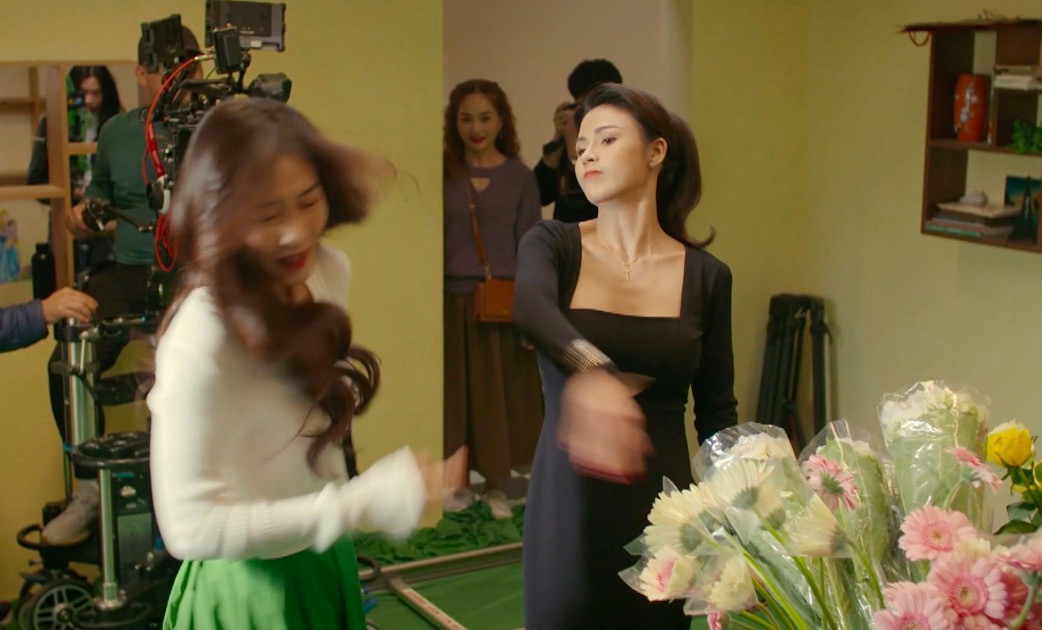Sau khi diễn lại cảnh tát lần thứ 5 thì Hà (Lan Phương) không chịu nổi nữa, liền lao vào đẩy ngã rồi mắng Hà Lan một trận ra trò ngay trên trường quay nhằm bảo vệ em dâu.