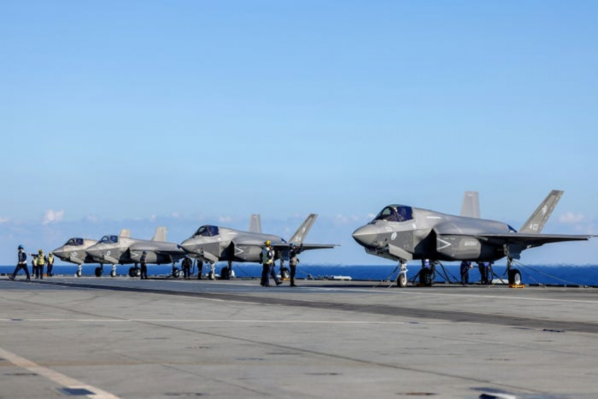 Máy bay F-35B của Italy, Anh và Mỹ trên tàu sân bay HMS Queen Elizabeth của Anh ở Biển Địa Trung Hải ngày 20/11/2021. (Ảnh: Bộ Quốc phòng Anh)