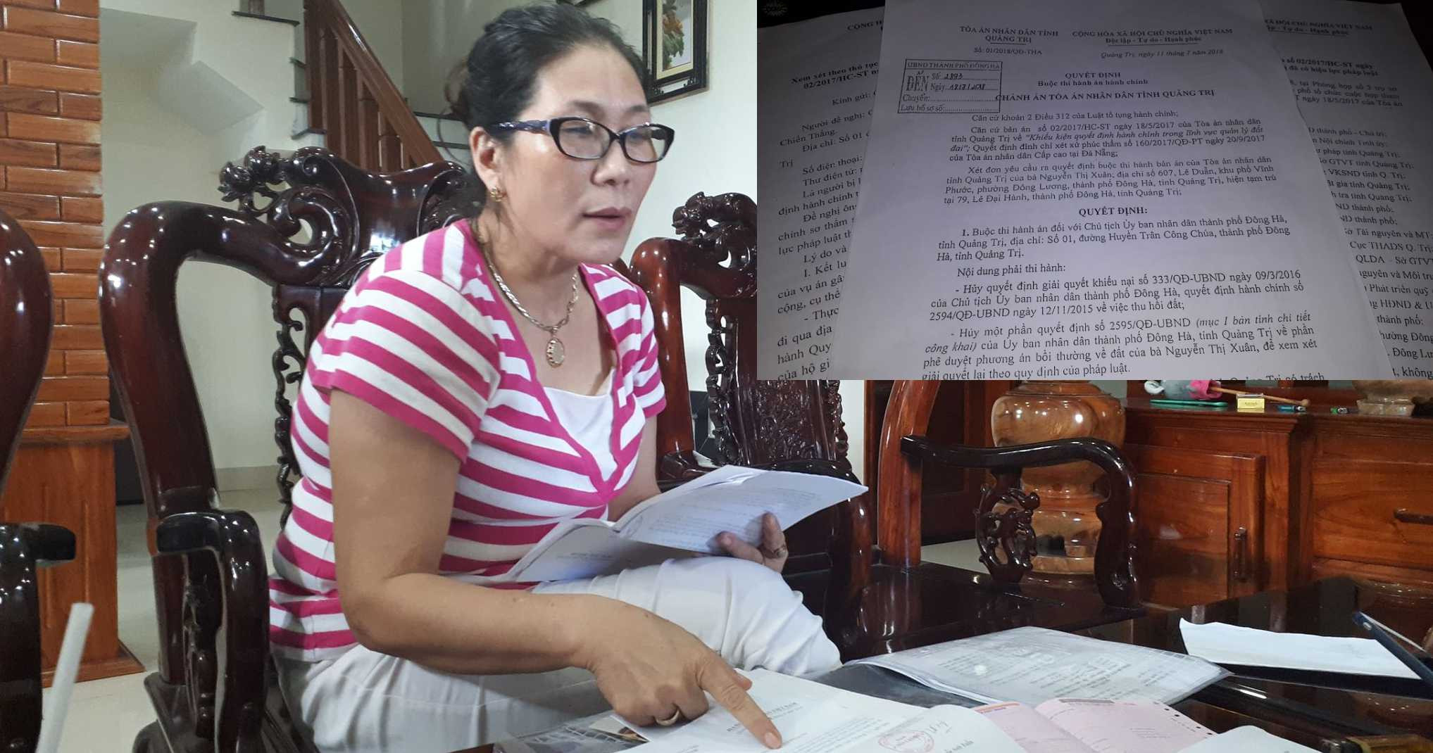 Theo bà Nguyễn Thị Xuân, ngày 15/8/2017, TAND tỉnh Quảng Trị mở phiên tòa xét xử vụ án khiếu kiện quyết định hành chính trong lĩnh vực quản lý đất đai. Nguyên đơn là bà Xuân và bị đơn là ông Nguyễn Chiến Thắng, Chủ tịch UBND TP Đông Hà.