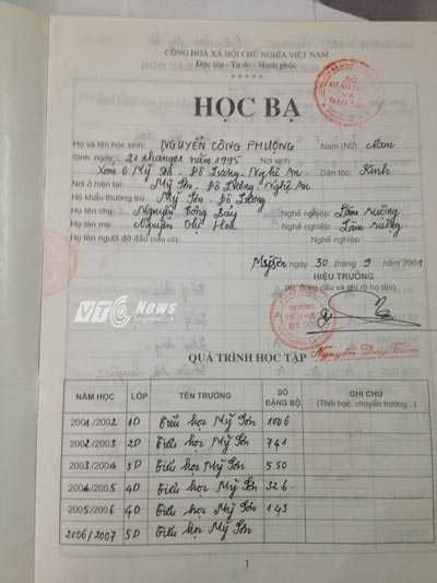 | Học bạ của Công Phượng tại trường tiểu học Mỹ Sơn |