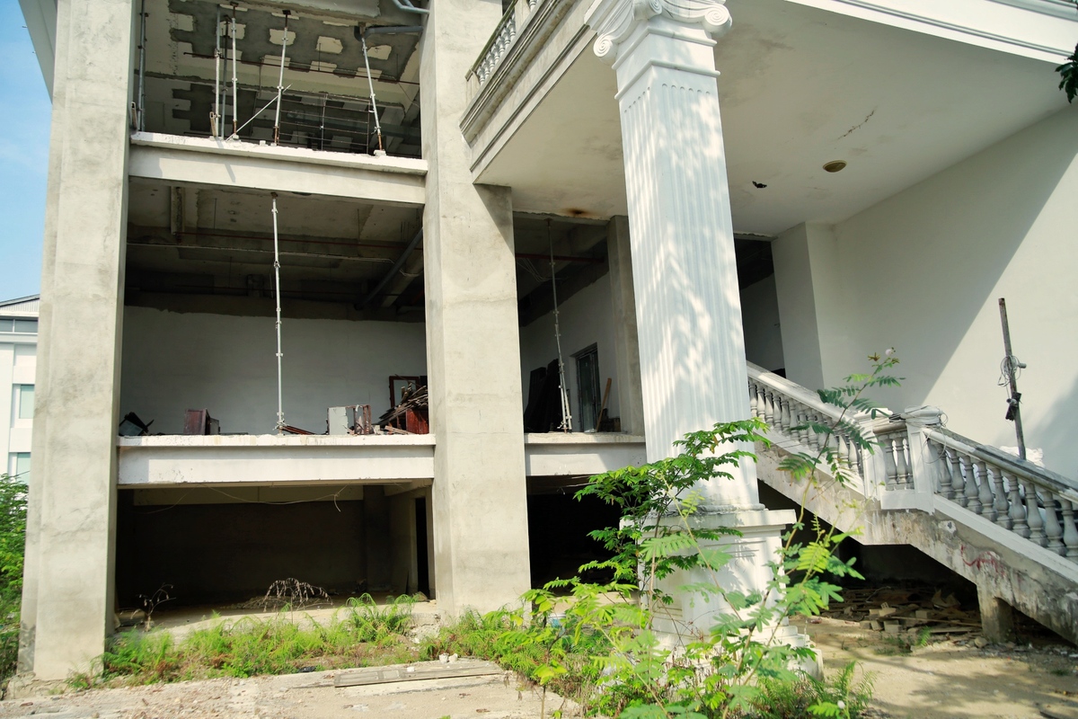 Nhìn ra bên ngoài tòa nhà được sơn trắng khá đẹp nhưng bên trong thì ngổn ngang.