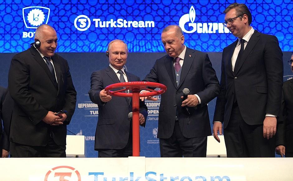 Tổng thống Nga Vladimir Putin và Tổng thống Thổ Nhĩ Kỳ Recep Tayyip Erdogan (giữa) dự lễ khánh thành đường ống dẫn khí "TurkStream" ngày 8/1/2020 tại Istanbul . (Ảnh: kremlin.ru)