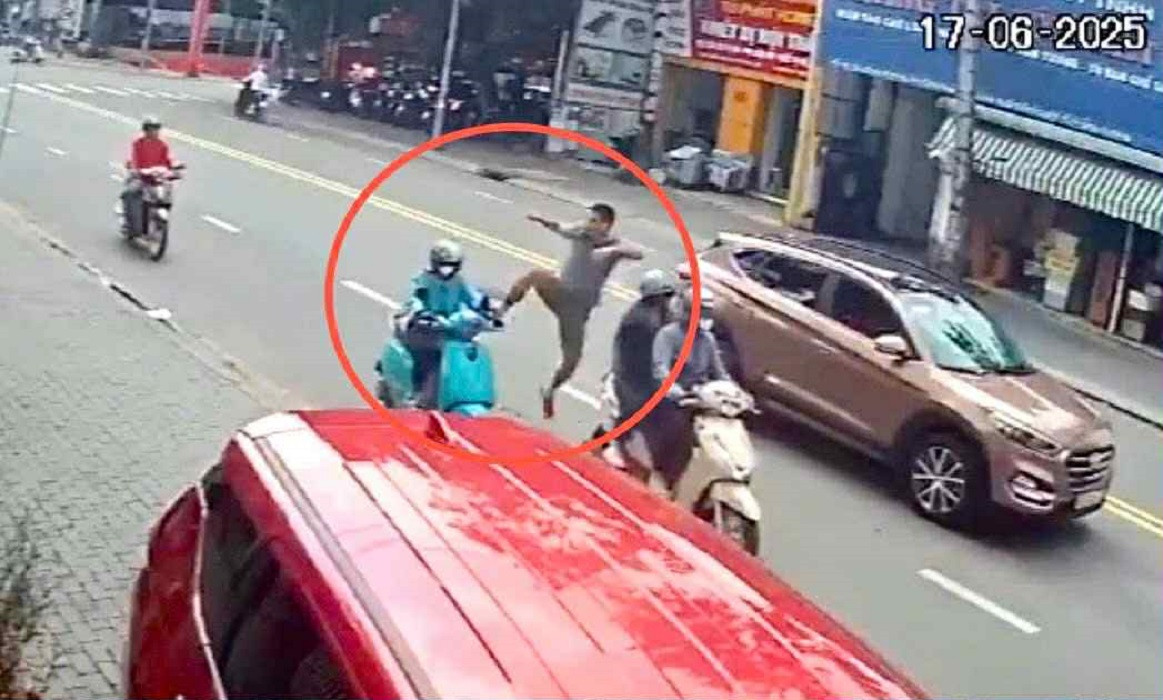 Cú đạp mạnh khiến người lái xe máy cùng chiếc xe ngã nhào trên đường.