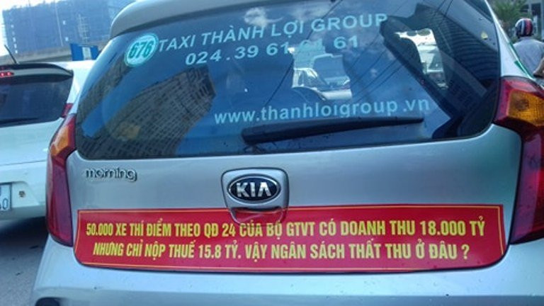 Gần đây, nhiều xe taxi chạy trên các đường phố Hà Nội và có gắn theo dòng chữ “50.000 xe thí điểm theo QĐ24 của Bộ GTVT thu 18.000 tỷ nhưng chỉ nộp thuế 15,8 tỷ. Vậy ngân sách thất thu ở đâu?”, những dòng chữ này khiến nhiều người tỏ ra ngạc nhiên.