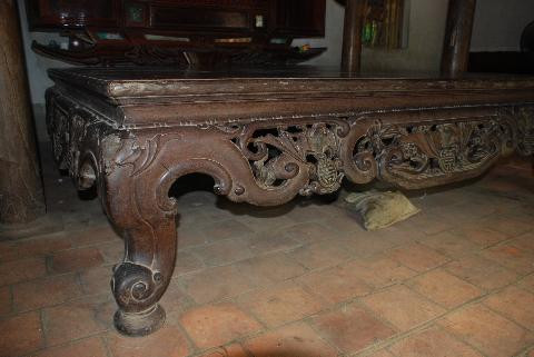 Gỗ sập không phải đinh, lim, sến, táu, mít già như sập của anh nhà giàu ở quê mà bằng gỗ gụ. Hoa văn thì chao ôi, tinh xảo lạ thường. Chân quỳ, dạ cá (bụng cái sập cong bè như bụng con cá - PV).