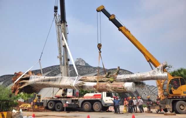 | Dùng cần cẩu cỡ lớn để đưa cây vào vị trí cũ |