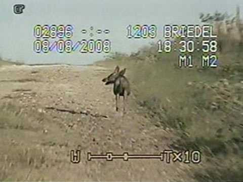 | Đoạn phim về con vật được cho là chupacabra do camera trên xe Phó Cảnh sát trưởng Brandon Riedel ghi. |