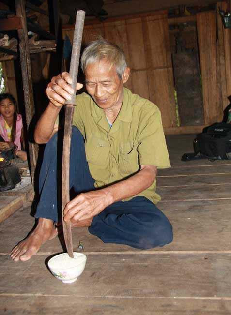 Đọc chú xong, ông sẽ tuốt gươm ra, huơ huơ mấy đường rồi từ từ cắm mũi gươm xuống mép bát gạo. Khi tay vẫn còn giữ chặt thân gươm, ông lại nhắm nghiền mắt và lại lầm rầm đọc chú. Chừng gần phút sau, khi câu chú cuối cùng vừa dứt thì cũng là lúc ông buông tay khỏi thanh gươm.