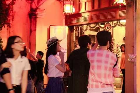 | Lý Nhã Kỳ bất ngờ bị bắt gặp khi đang đi dạo phố đêm Hội An cùng "nữ hoàng giải trí" Hồng Kong Xa Thi Mạn và một số người bạn. |