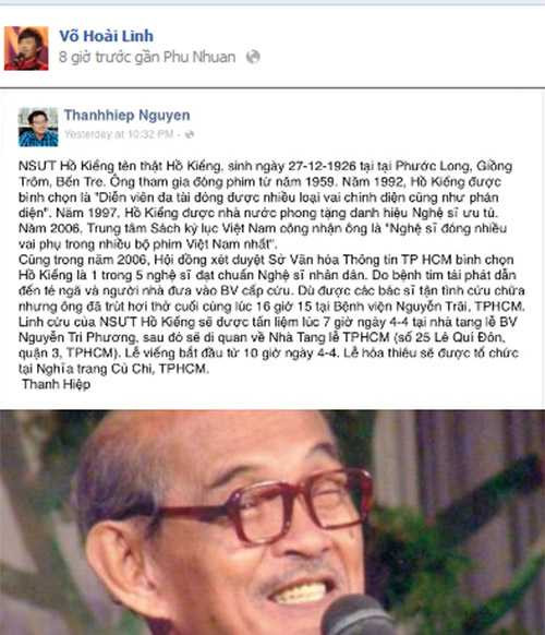 | Chia sẻ của danh hài Hoài Linh trên trang cá nhân về sự ra đi của NSUT Hồ Kiểng. |