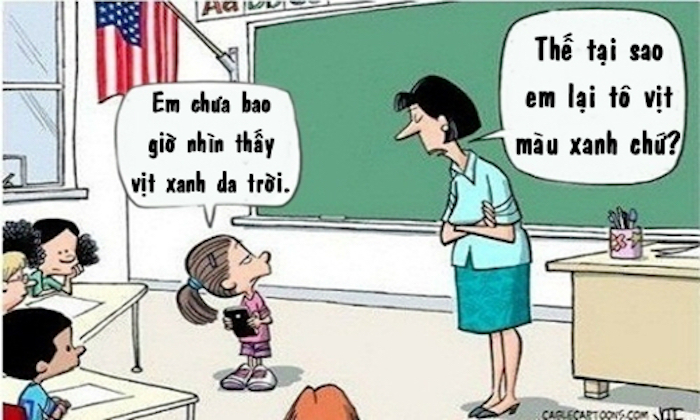 Cô dặn tô con vịt màu vàng và tô màu xanh da trời cho cái ô. Cả lớp đều ngoan ngoãn vâng lời, trừ bé Pinky. Cô giáo cầm bài tô màu của Pinky, nhíu mày hỏi: