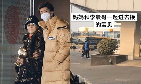 Lý Thần không chỉ ân cần giúp nam ca sĩ đẩy hành lý mà còn cầm tay bà Trương Truyền Mỹ và trò chuyện rất vui vẻ với bà.
