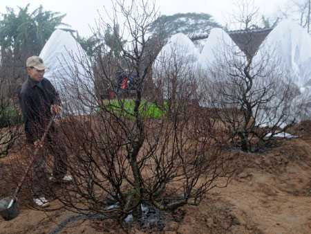 Ông Đỗ Văn Kim (66 tuổi, ở cụm 1, phường Nhật Tân, quận Tây Hồ, Hà Nội) có 20 năm gắn liền với trồng đào cho biết:'Nghề này 70% phụ thuộc vào thời tiết, do vậy, mấy ngày rét liên tục gần đây, ông phải bón thêm phân tổng hợp, tưới nước cho cây, 'mặc áo' sưởi ấm'.