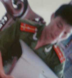 | Hòa mặc cảnh phục, giả công an nhận tiền "chạy việc". Ảnh do nạn nhân chụp lại. |