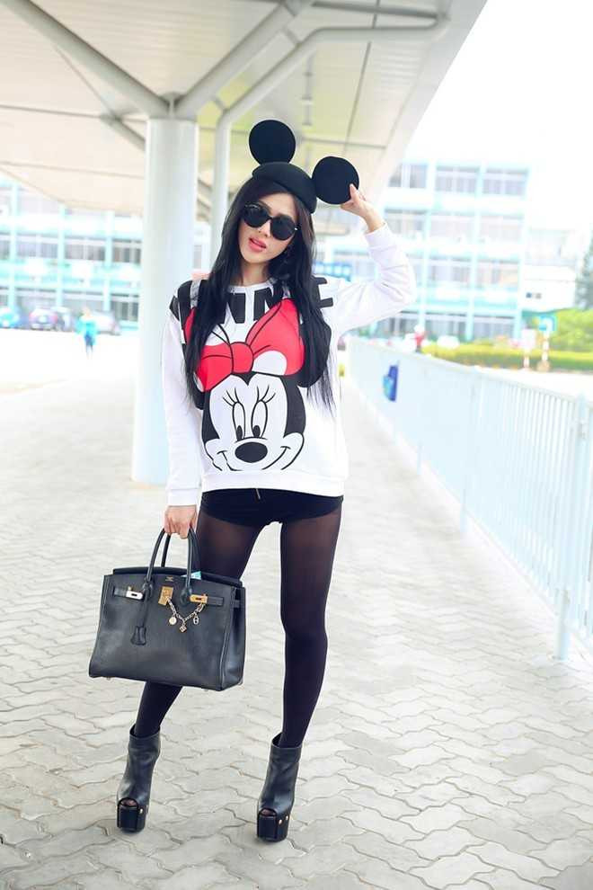 | Đinh Phương Ánh bị cho là hồi teen quá đà với trang phục không phù hợp với độ tuổi 29. Chiếc mũ Mickey kết hợp cùng áo thun khá dễ thương chỉ dành cho những cô gái mới lớn. |