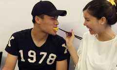 Hôm 8/9, trên trang cá nhân, Mạc Hồng Quân khoe bức ảnh được bà xã Kỳ Hân đút thức ăn khi đi ăn tại một nhà hàng ở Hà Nội. "Lâu lắm mới được vợ đút cho ăn", tiền vệ CLB Than Quảng Ninh viết chú thích.