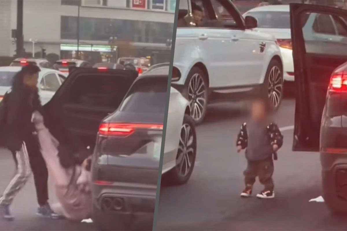Sự việc cảy ra ngày 7/12 trên một con đường rất đông xe cộ qua lại ở Hàng Châu, Trung Quốc. Một chiếc Porsche SUV đang di chuyển bỗng nhiên dừng lại. Một người đàn ông xuống xe, mở cửa sau rồi thô bạo lôi người phụ nữ đang bế một em bé tầm 2 tuổi ra khỏi xe.