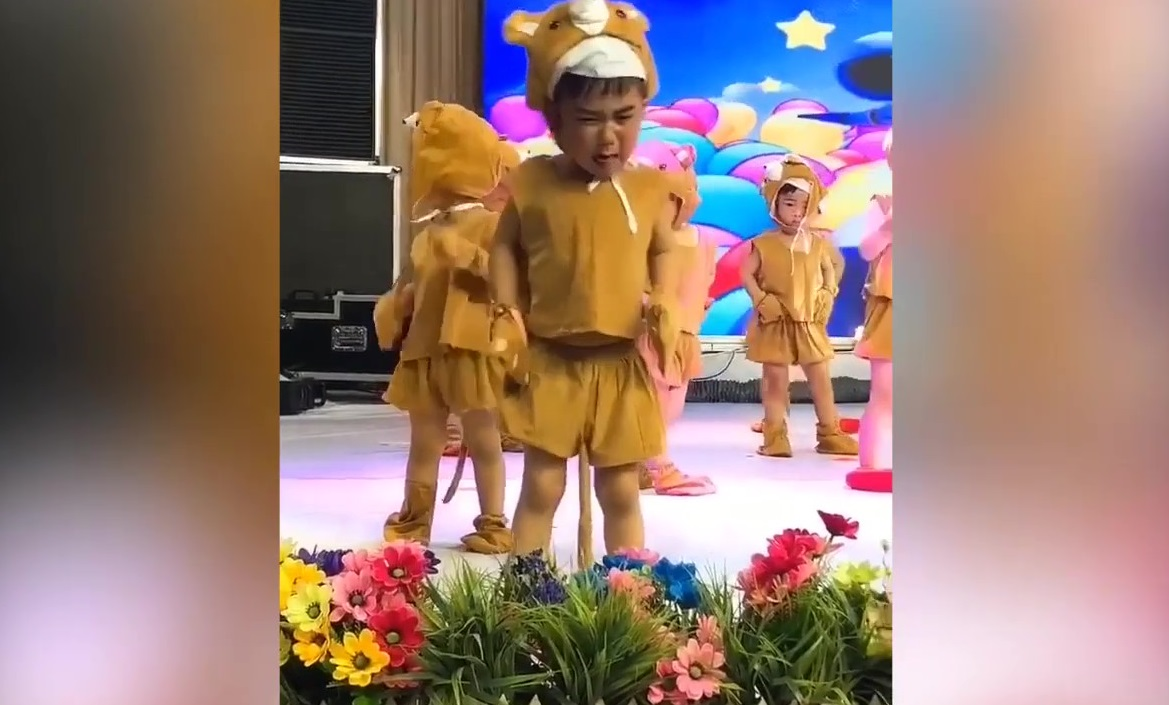 Mặc dù khóc nức nở vì xấu hổ nhưng cậu bé vẫn không quên nhiệm vụ biểu diễn hết mình với chiếc quần mặc ngược.