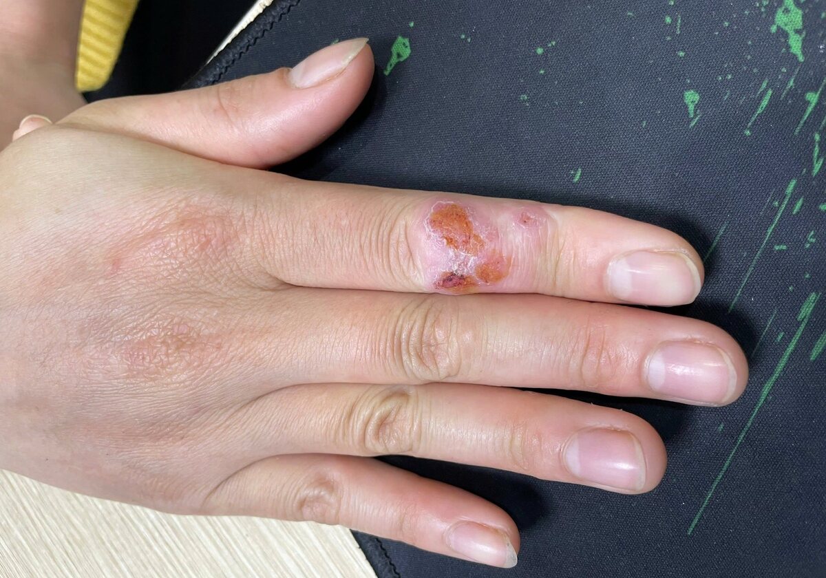 Ngón thứ hai bàn tay phải của người đàn ông bị sưng đỏ do nhiễm Mycobacterium. (Ảnh: BSCC)
