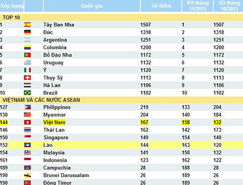 Ở bảng xếp hạng tháng 11/2013, Việt Nam tụt 7 bậc, từ 151 xuống 158, xếp dưới Philippines, Myanmar, Thái Lan, Singapore và chỉ ngang hàng với Malaysia. Tuy nhiên ở bảng xếp hạng tháng 12, chúng ta lại có những bước tiến không ngờ.